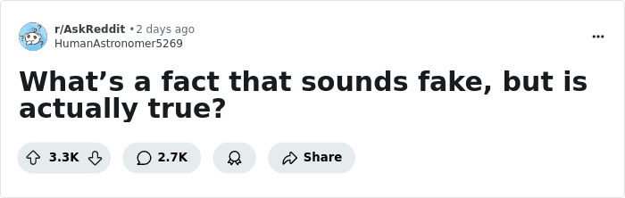 Someone asked “What’s a fact that sounds fake, but is actually true?” and netizens shared their best examples. So get comfortable as you scroll through, upvote your favorites and be sure to add your own thoughts and examples to the comments section down below.