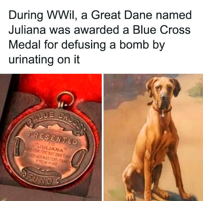 During World War Ii, a Great Dane named Juliana became a canine hero. In 1941, a German incendiary b**b landed in her owner’s home in England. Without hesitation, Juliana urinated on the device, extinguishing it before it could cause an explosion. Her quick thinking saved lives and earned her a medal for bravery from the Blue Cross, an animal welfare charity.