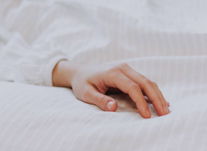 I step a little closer, the womans skin is “bruised” and has mouldy patches on it. This is not a “yoga pose”, this is a “settling in to the bed” pose.