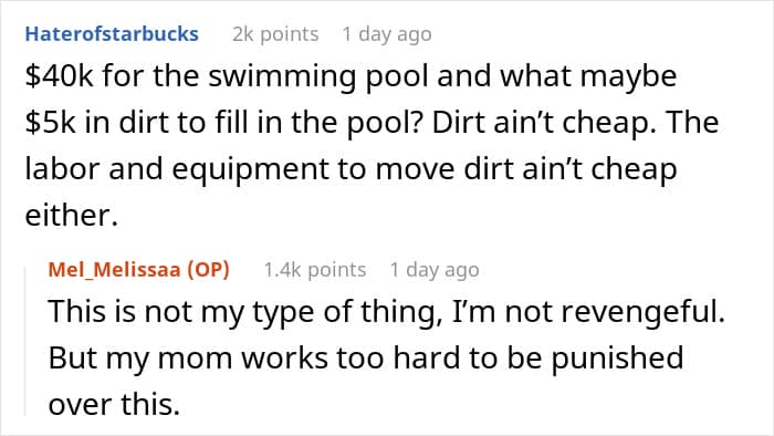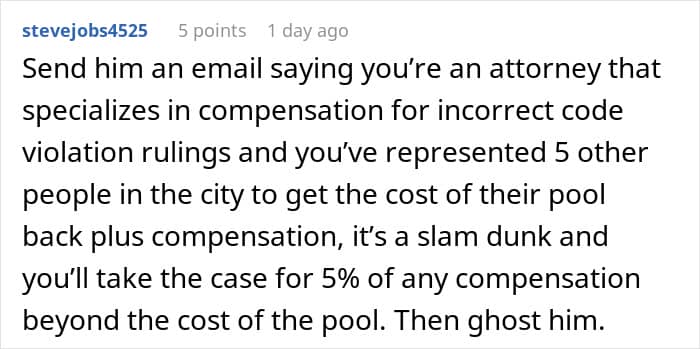 She got her payback by unraveling the man’s illegal pool, which he lost, and cost him a large amount of money in the process