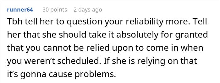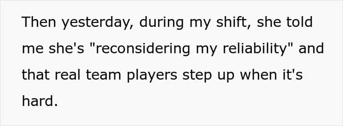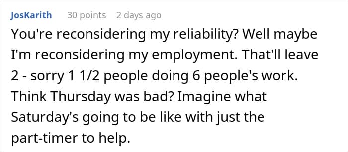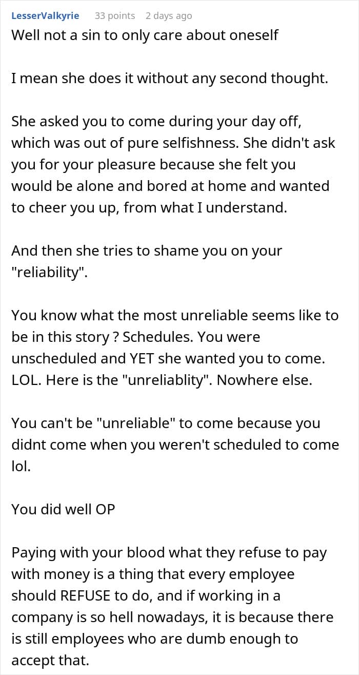 RELATED:A retail worker refused to come in to work on her day off and was accused of not being a “team player”