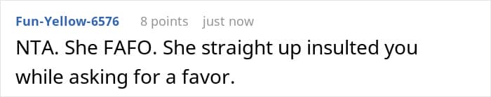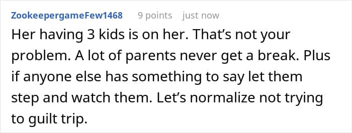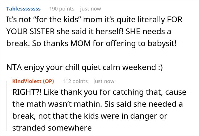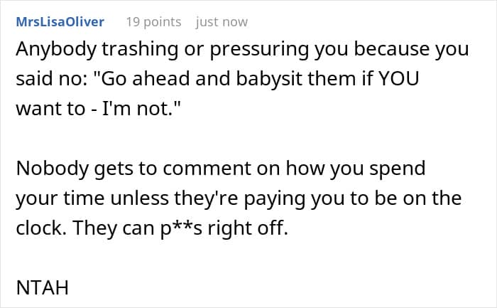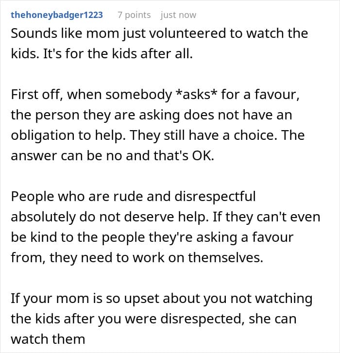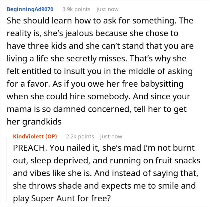 The OP didn’t need to look for alternative ways to show love and support to her sister; she was fine with babysitting her kids. That was, however, until the mom-of-three made comments about how her sister spends her time, as after hearing that, the OP was in no mood to look after anyone. Netizens in the comments were unanimous, saying that refusing to babysit the kids didn’t make the redditor a jerk in the situation.