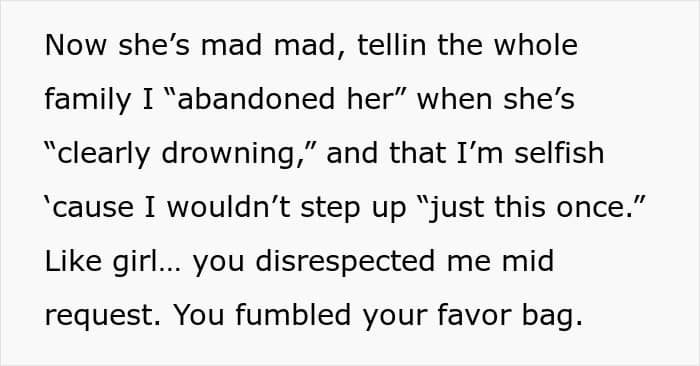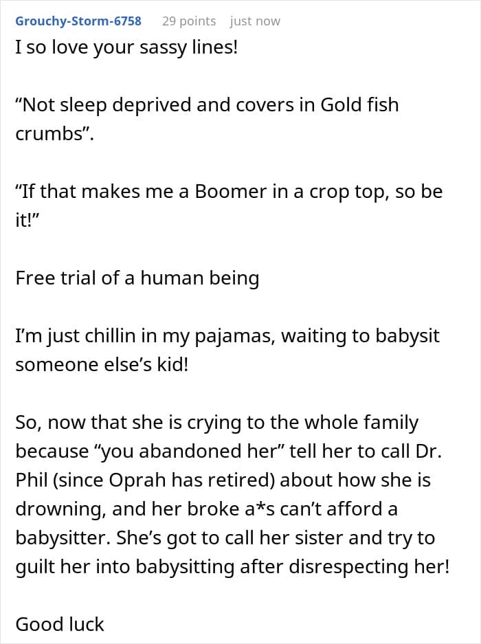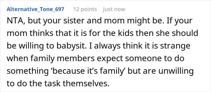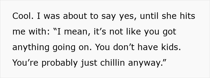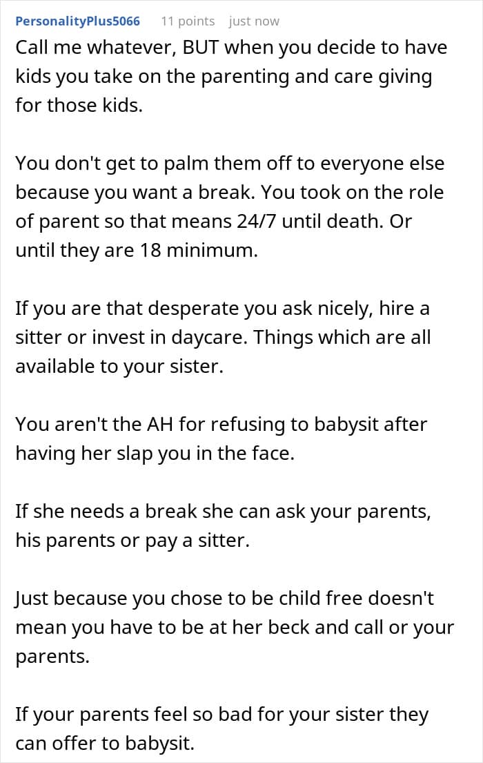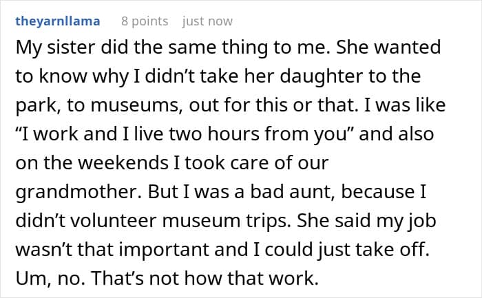 Some people might think that—whether it’s a brother, a sister, a cousin, or a friend—child-free people might have a lot of time on their hands just because they don’t have children, similarly to what the OP’s sister believed. But just because they don’t have little ones of their own to look after, it doesn’t mean they don’t have other things to do or that they will be available whenever the parent needs their help. That’s why it’s important for child-free individuals to set healthy boundaries with people, including family members, who expect them to help with childcare.