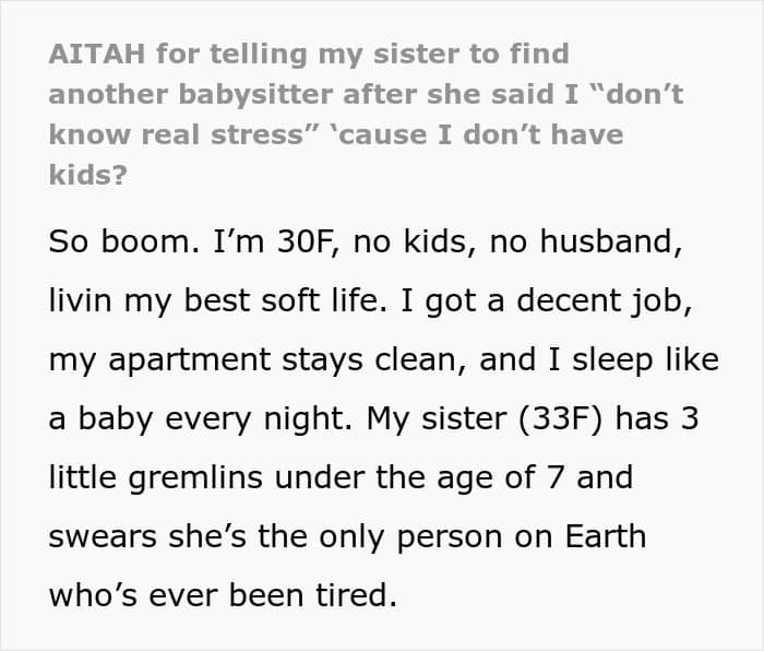 While it’s true that child-free people usually get to enjoy more moments of peace and quiet, it doesn’t necessarily mean that they don’t do anything with their time or that they don’t know what stress is. Though this is exactly what this woman’s sister, a mom of three, suggested, as she was asking the OP to babysit her kids.