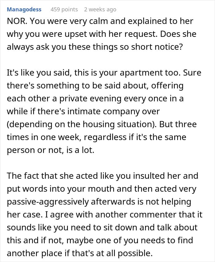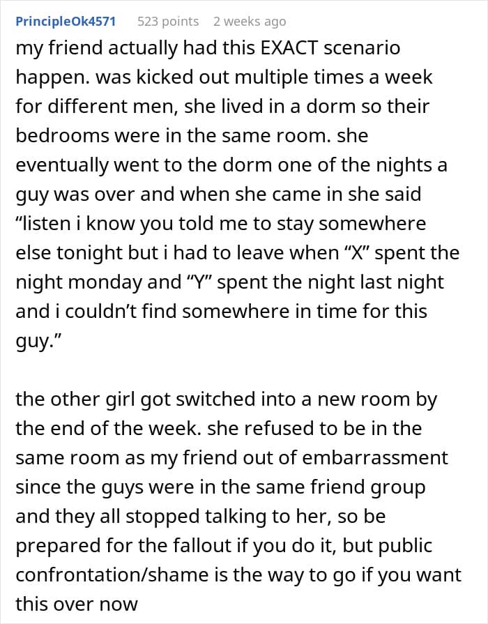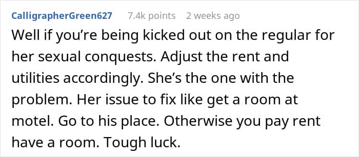 People were annoyed by the poster’s predicament and felt that there was no reason for her to constantly be kicked out due to her housemate’s conquests