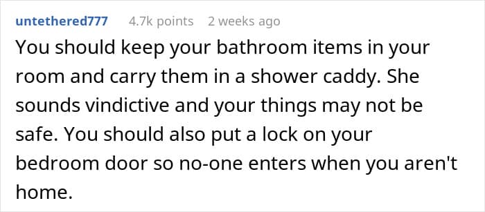 After the woman confronted her roommate about her actions, the other lady stayed over at her date’s place. She also behaved very passive-aggressively when she returned and took out her frustration on the OP’s conditioner. It’s clear that she didn’t think she was in the wrong and felt that her housemate was making a big deal out of nothing.