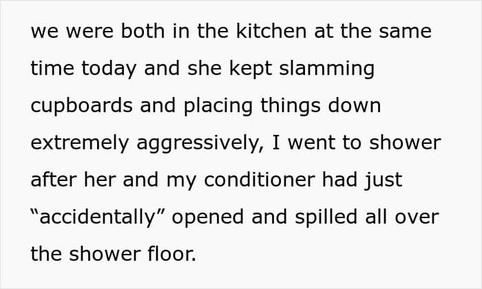 Eventually, the conflict was so heightened that the roommate behaved passive-aggressively with the woman and “accidentally” spilled her conditioner