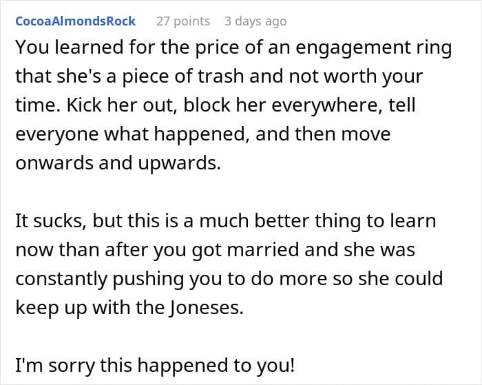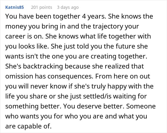 When they got home, his girlfriend brushed him off with the classic “it isn’t the right time,” but he knew that wasn’t the actual reason she turned him down. So after pressing her, she finally admitted what was really going on. She confessed she wanted to marry someone rich, someone who could fully take care of her financially, without guilt.
