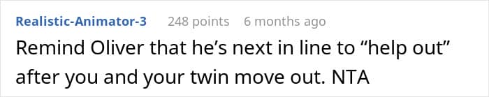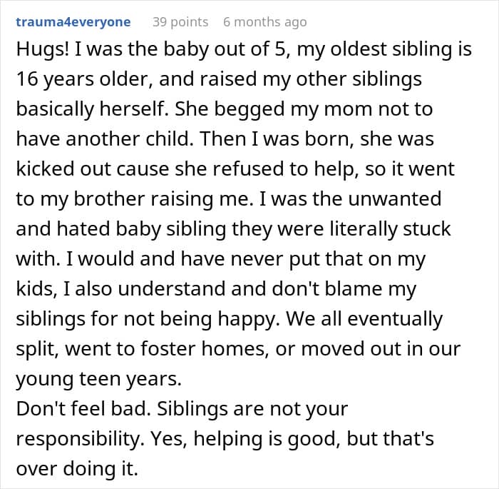 The OP and his sister missed out on so much of just being normal teens because there was always homework to check, a bath to give, or a baby to rock to sleep. While his friends were out making memories, he was stuck running bedtime routines. But the straw that broke the camel’s back came when the OP was told to cancel plans with friends to babysit yet again.