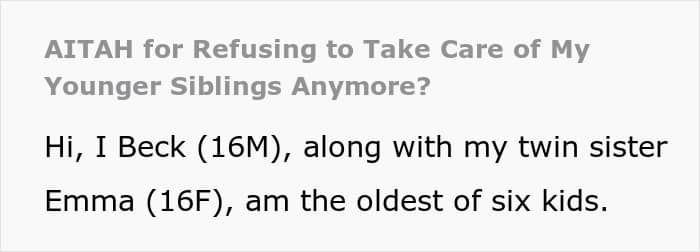 The OP (original poster) is a 16-year-old with a twin sister, Emma. Instead of spending their teen years stressing over exams, crushes, and TikTok dances, these two have been changing diapers, supervising homework, and running bedtime routines for 6 younger siblings since they were old enough to hold a baby.