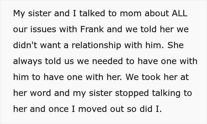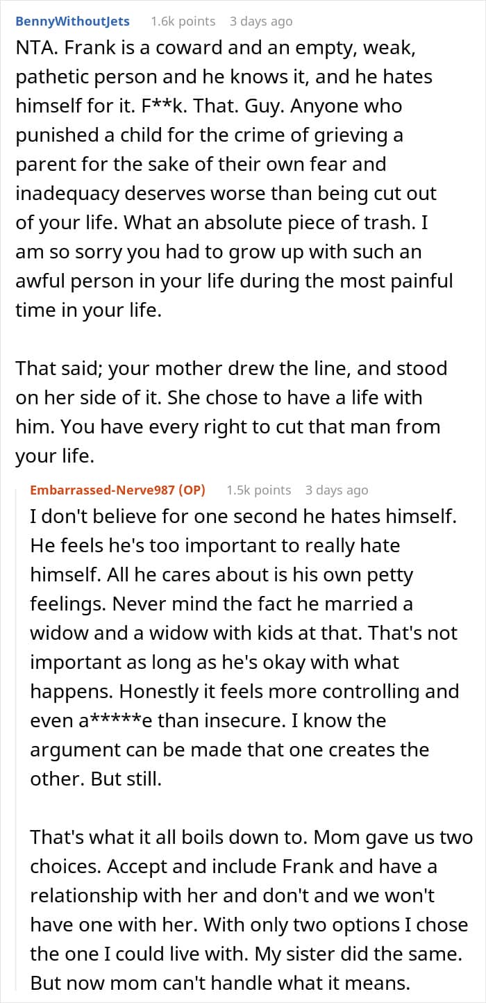 This stepfather even forbade mentioning the biological father in the household, which pushed the kids to go no contact and leave their mom behind
