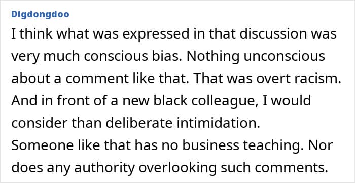 There was “unconscious bias” training at the school where the original poster (OP) is a new hire. However, the event turned quite hypocritical after a racist teacher made some disgusting remarks, which clearly hurt another new hire, who is Black. Read on to find out what the poster plans to do about it!
