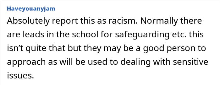 Today’s story is actually quite distressing because of the blatant racism displayed by some people. It begins with the poster informing us that she has recently joined as a trainee teacher at a school. Apparently, a few kids had reported racism in a student survey, so they had unconscious bias training on her induction day.