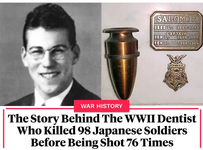 In 1944, Army dentist Benjamin Lewis Salomon found himself 50 yards from the front lines in Saipan, with Japanese soldiers quickly approaching. Salomon ordered the aid tent he was in with over 30 wounded soldiers to be evacuated while he held off the attackers. When his infantry would later return, they found Salomon surrounded by 98 dead Japanese soldiers Salomon had been shot 76 different times, 24 of them while he was potentially still alive.