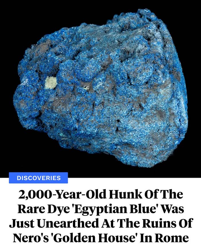 Archaeologists excavating the remains of Rome’s “Golden House,” the opulent palace that Emperor Nero built for himself right across the street from the Colosseum, recently uncovered a rare chunk of the prized pigment “Egyptian Blue.” Known for its striking cerulean hue, this dye was first created circa 3250 B.C.E. and was soon used throughout the ancient world in everything from Egyptian mummy portraits to Roman frescoes to Greek statues. And while archaeologists usually only uncover mere scraps or powdery remnants of this pigment today, the newly-found chunk is an astonishingly large artifact measuring six inches across and weighing more than five pounds. Researchers found it near a pool once used to mix dyes and they believe it was going to be used to paint frescoes on Nero’s walls.