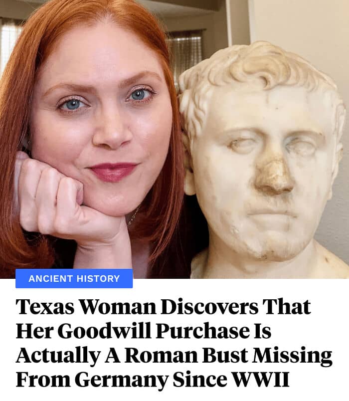 A marble statue sold at a Texas Goodwill for $34.99 has turned out to be a priceless Roman artifact once owned by King Ludwig I of Germany. The bust was part of Ludwig I’s collection at a museum in Bavaria, but it vanished after the Allies bombed the building in 1944. Experts suspect that it was likely looted by an American soldier and then brought illegally to the United States. Then, nearly 80 years later, a woman shopping for secondhand items to resell found it “on the floor, under a table” and decided to buy it because, “It looked pretty dirty, pretty old” — and then she discovered the statue’s astounding story.