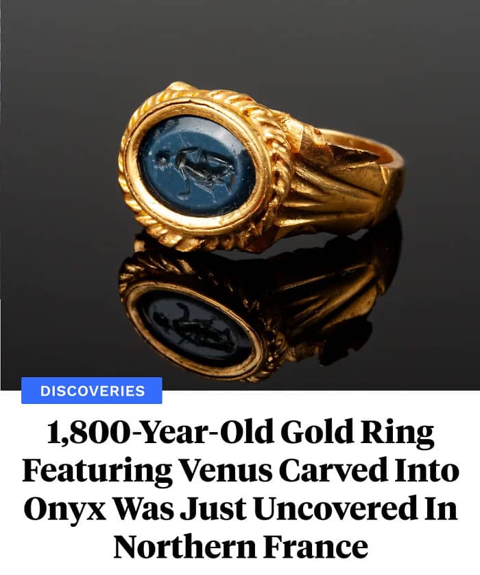While preparing for construction near the town of Pacé in the Brittany region of northern France, archaeologists recently unearthed an 1,800-year-old ring along the remains of a Roman road. Discovered in an “exceptional state of preservation,” this gold ring is adorned with a type of blue onyx known as nicolo that’s inscribed with a depiction of the goddess Venus. Right nearby, archaeologists also uncovered a layer of medieval remains including food silos, cooking pots, and even remnants of 1,300-year-old grains and legumes.