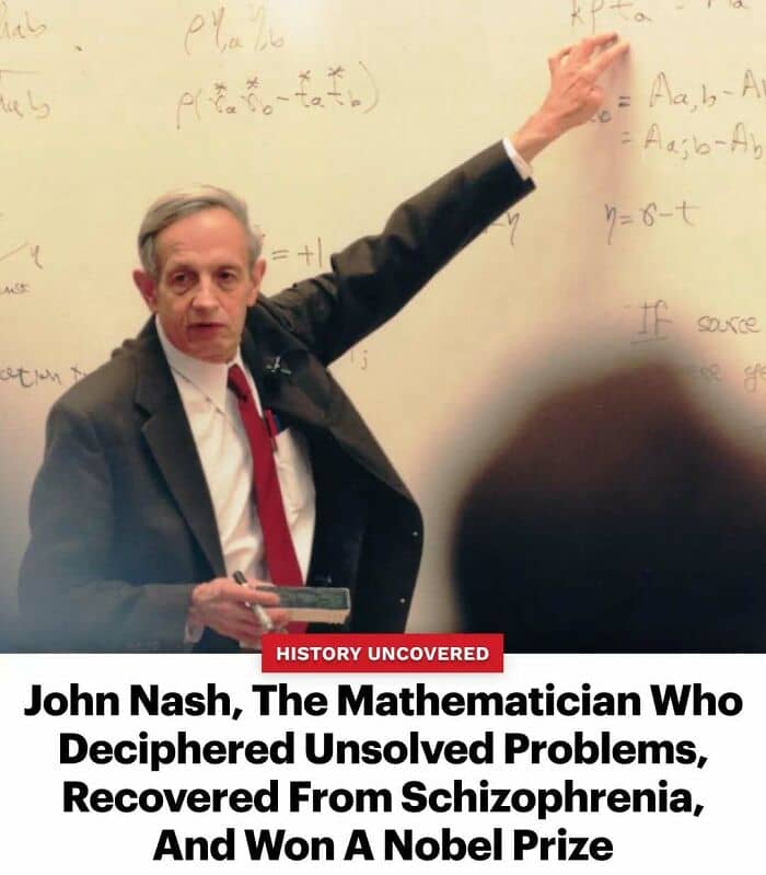 John Nash excelled in math from an early age, and after graduating from Carnegie Mellon with two degrees in the subject in 1948, he decided to pursue his doctorate at Princeton. One reference letter he submitted with his application to the program simply read, “This man is a genius.” In 1951, he accepted a position as a math professor at the Massachusetts Institute of Technology, where he solved a classical unsolved problem and published research papers on differential geometry and economic game theory. However, Nash’s promising academic career came to an end in 1959 when he was diagnosed with schizophrenia. Despite spending the better part of a decade involuntarily hospitalized, he went on to publish several more renowned papers — and even won a Nobel Prize in economics in 1994.