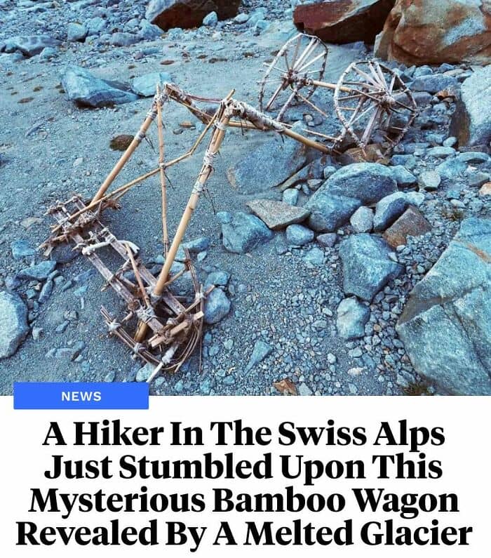 On November 2, a hiker was walking near Splügen Pass on the border of Switzerland and Italy when he spotted a bizarre object at the end of a melting glacier. Upon closer inspection, he saw that it appeared to be a wagon with two wheels made up of bamboo rods and cords. Bamboo is not native to the area, and it wasn’t introduced to Europe until the 16th or 17th century, so archaeologists believe the cart-like object dates to the 1900s — but they have no idea what it was used for or how it got to the Swiss Alps.