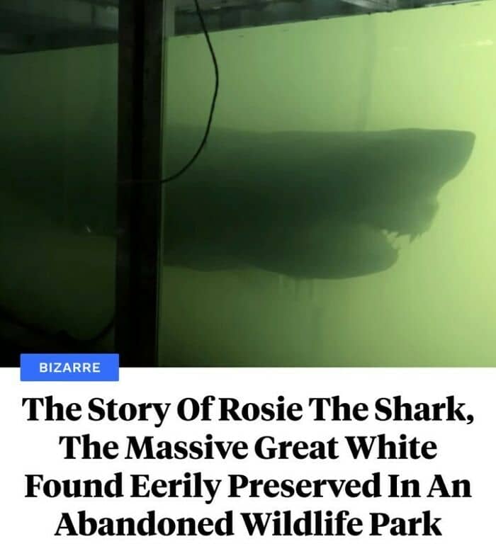 In 2018, urban explorer Luke McPherson crept onto the grounds of the long-abandoned Wildlife Wonderland park in Southern Australia. Its empty, darkened hallways were eerie enough on their own, but then his camera captured something truly unexpected: a two-ton great white shark floating in a tank of formaldehyde. His video of this eerie encounter soon racked up millions of views on YouTube and sparked renewed interest in Rosie the Shark, a minor wildlife celebrity in Australia that was forgotten when Wildlife Wonderland was forced to shut its doors. McPherson’s video also caught the attention of a wildlife rescue organization in Australia — and now Rosie is undergoing restoration at Crystal World Exhibition Centre in Victoria.