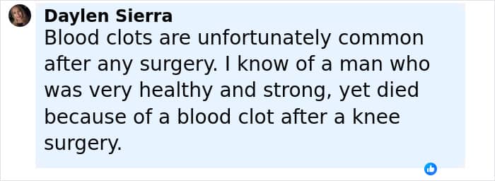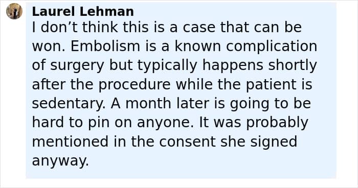 “This pulmonary embolism occurred because of this surgery,” the lawyer stated.
