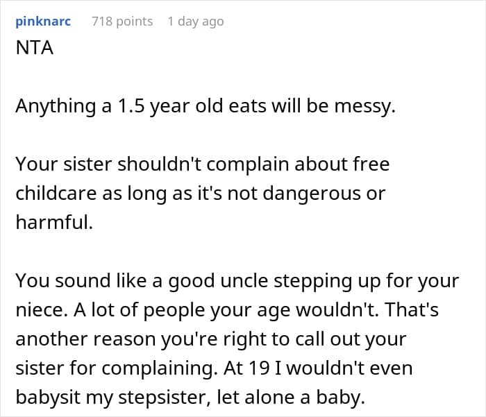 Life in one household has gotten pretty complicated after OP, 19, stepped up to help raise his sister’s baby. He shared that he lives with his parents, his older sister Ruth, and her 1.5-year-old daughter Scarlet, and that, while Ruth is technically the mom, OP and his parents do most of the actual parenting.