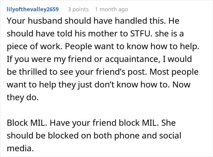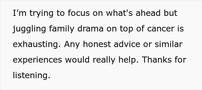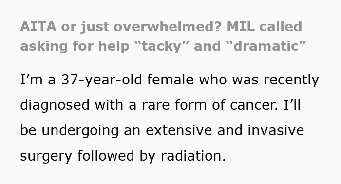 And it’s exactly what this woman had in mind when she asked for some help looking after her kids and covering the costs of her treatment trips in an online post. However, her mother-in-law thought it was “tacky” and “dramatic”, chastising her that it’s “not the family way”. Angry and confused, the woman decided to ask for opinions online.