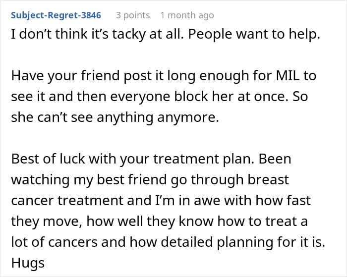 RELATED:A cancer patient asked for help from friends online, and was told it’s too ‘tacky’ and ‘dramatic’ by her MIL