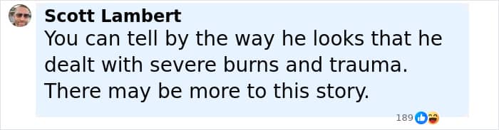 “You can tell by the way he looks that he dealt with severe burns and trauma. There may be more to this story,” one reader suggested.