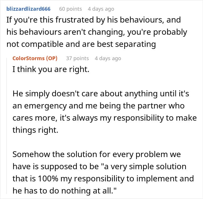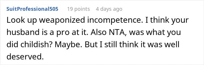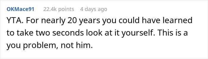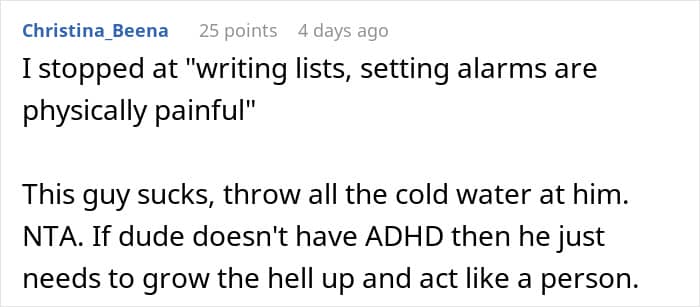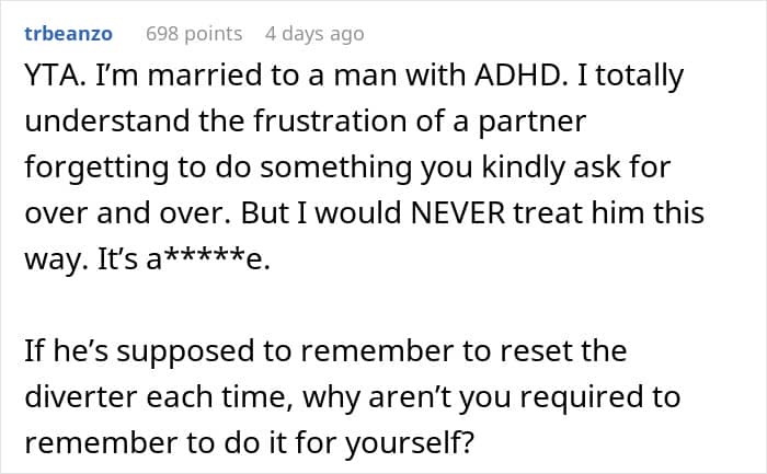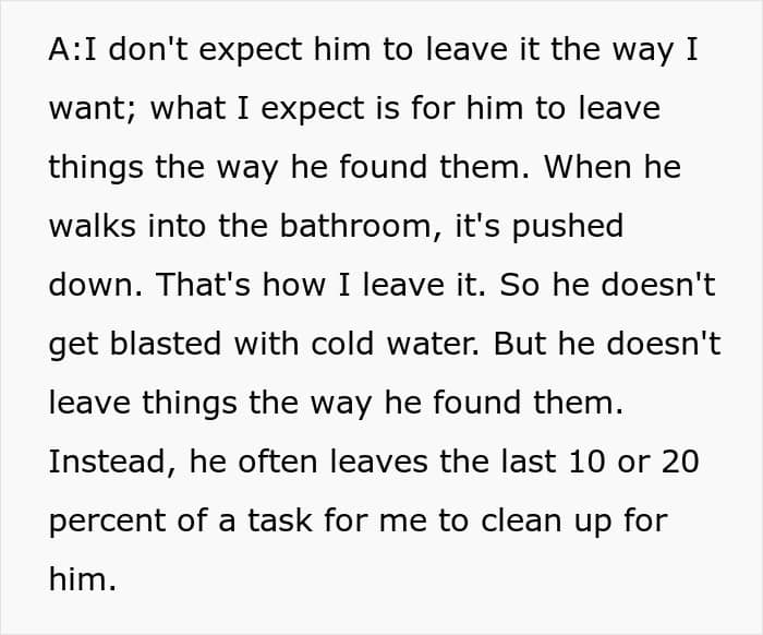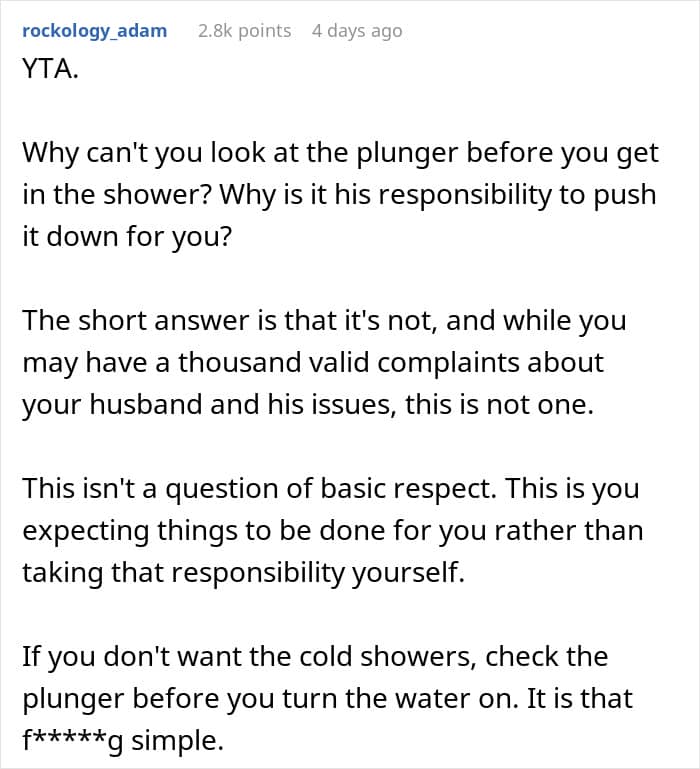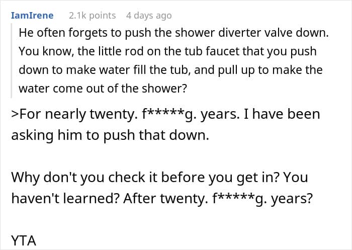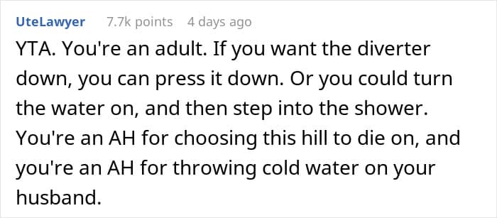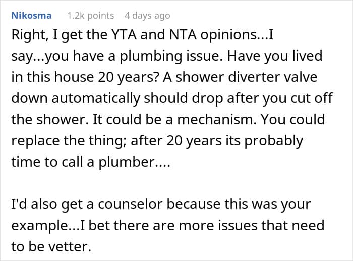 At the same time, this relationship seems to have some major, major communication problems. This is perhaps one of the reasons readers were conflicted on if she was the “jerk” in this situation or not. Just throwing water at your spouse is pretty questionable behavior. The real discussion was about how justified (or unjustified) it actually was. Some saw it as the breaking point of a very toxic relationship, others saw it as her being unable to just take a second to look at a facet before showering.