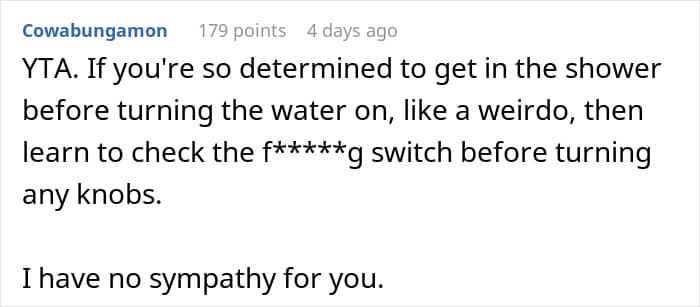 A woman turned to the internet for advice after having it up to here with her husband constantly leaving the water in their shower on cold and deciding to get revenge. Her plan, as it turns out, was somewhat controversial, as netizens debated its ethics in the comments. We reached out to the woman who made the post via private message and will update the article when she gets back to us.