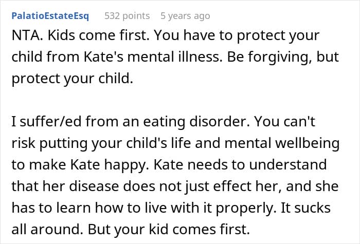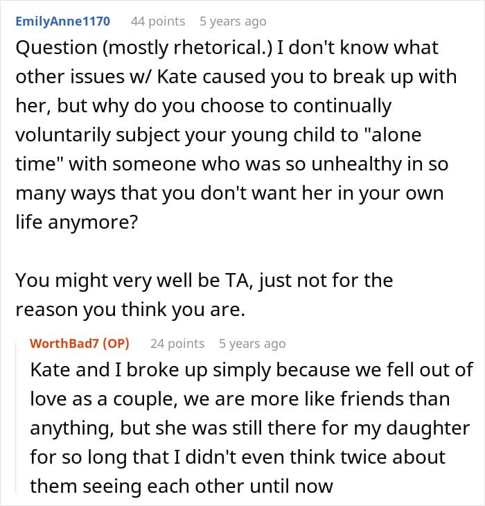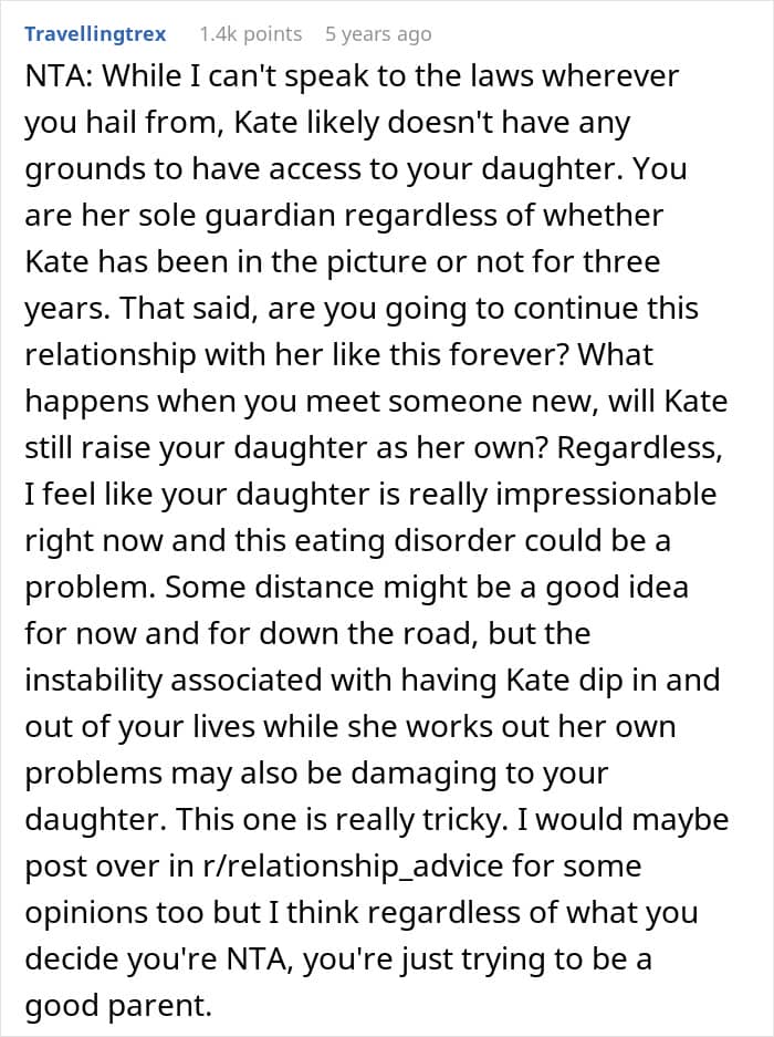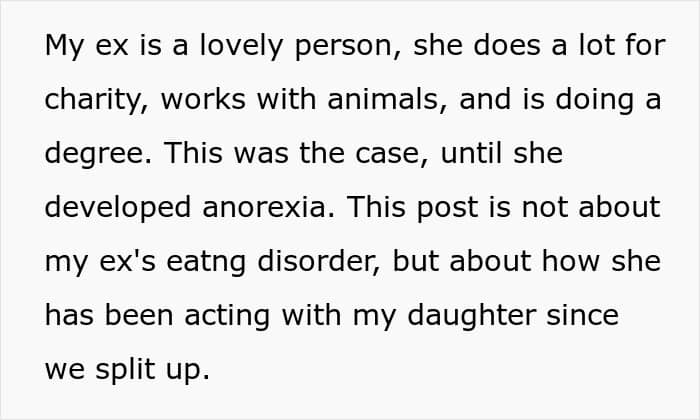 That’s exactly the heartbreaking situation today’s Original Poster (OP) found himself in. He turned to the internet with a gut-wrenching dilemma after his young daughter was starting to pick up dangerous eating habits from his ex-girlfriend, who struggles with anorexia. And as much as he wants to support his ex, he’s faced with the question every parent dreads.