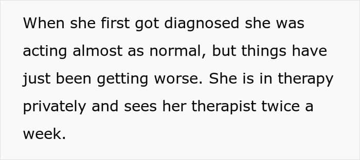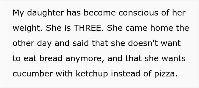 However, alongside her studies and charity work, the ex developed anorexia. At first, she seemed to manage her condition while still being involved with the child, but things started slipping. The OP noticed that his daughter began refusing bread because “it makes you chunky,” and also started refusing to eat pizza and would rather ask for cucumbers and ketchup.