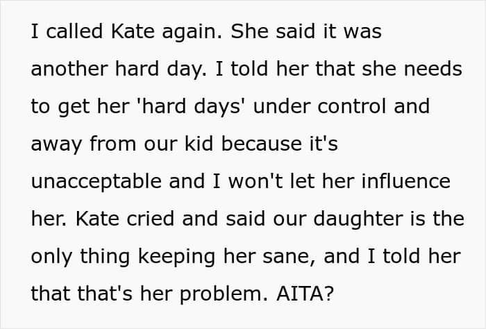 He confronted the ex again, and like the last time, she claimed she was having another hard day. The OP insisted that she got her hard days under control because he couldn’t have them influencing the child, but she broke down in tears, saying that the child was her anchor in life.