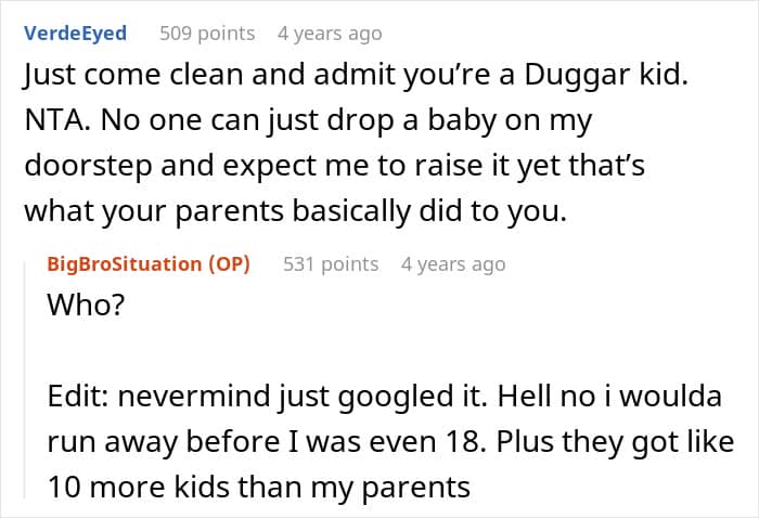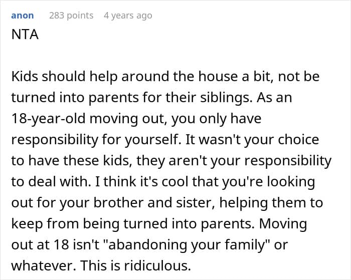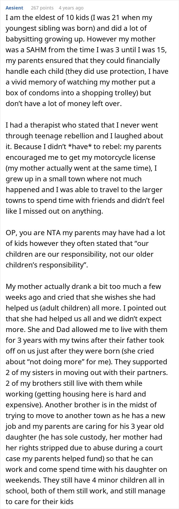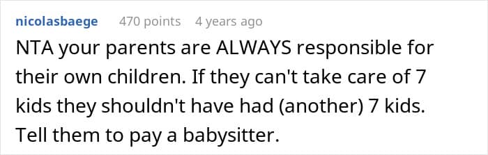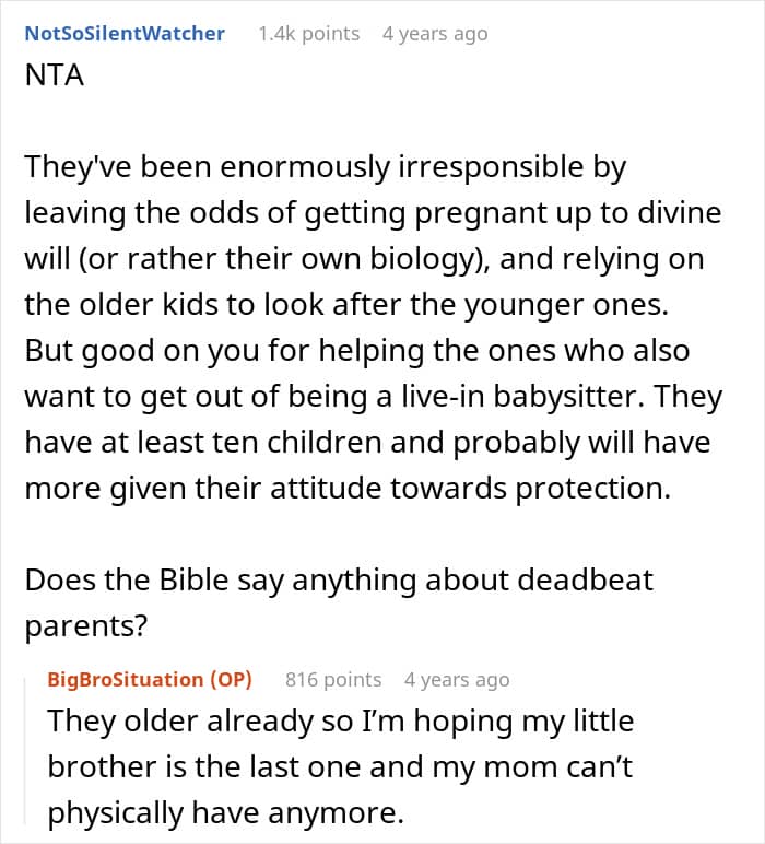 Thus, the responders claimed that the decision to have so many kids doesn’t belong to the author, but to his parents, and it’s they who should actually bear the full responsibility for this. The commenters are also sure that the OP didn’t actually turn his back on his family, but simply chose to live his own life, and gave the same, quite reasonable, advice to his siblings. So do you, our dear readers, also agree with this point of view?
