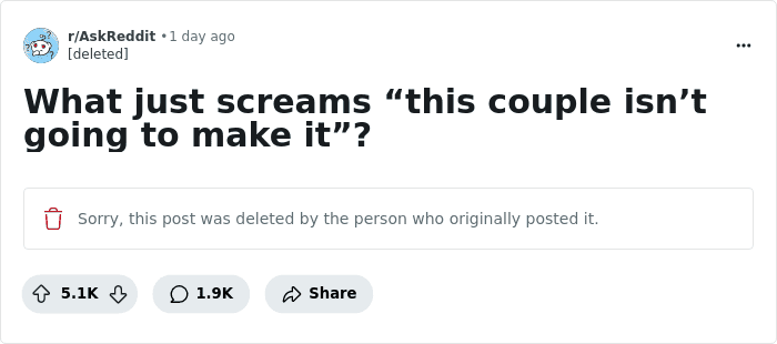 So when a Reddit thread asked people to share the biggest giveaways that a relationship is heading towards a breakup, a bunch of fortunetellers chimed in with their expertise.
