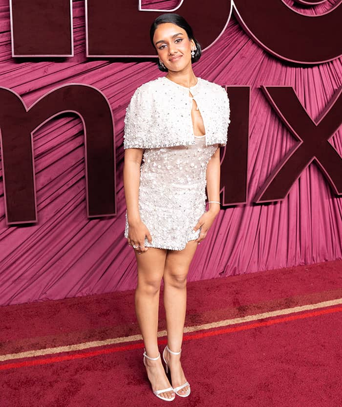 She completed her glam with matching sheer tights, dainty silver earrings and a bangle, and open-toe heels, while sporting a minimal makeup look.