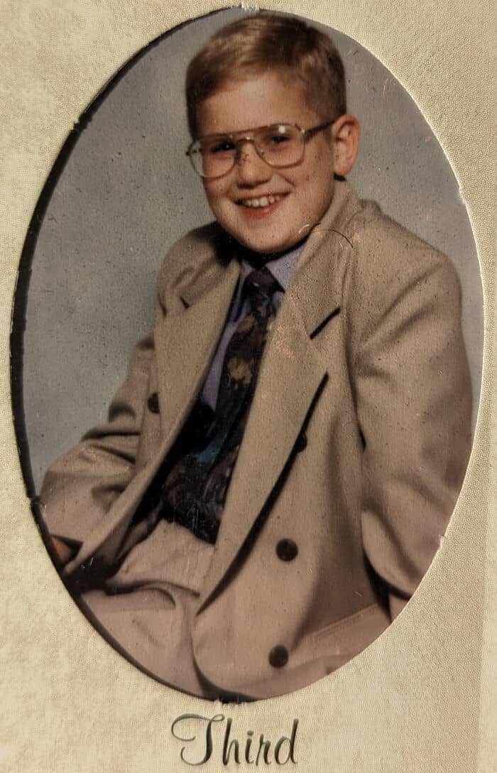 #46 4th Grade 1991, Laser Background, Big Wire Frame Glasses And Ministry Shirt. Doesn’t Get Much More Early 90s Than This