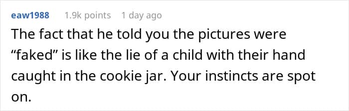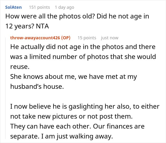 For 12 years, the poster couldn’t act on her suspicions because her husband kept insisting that the woman was posting old pictures of him with her