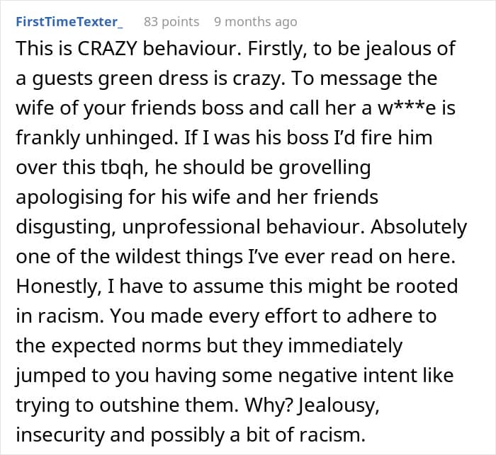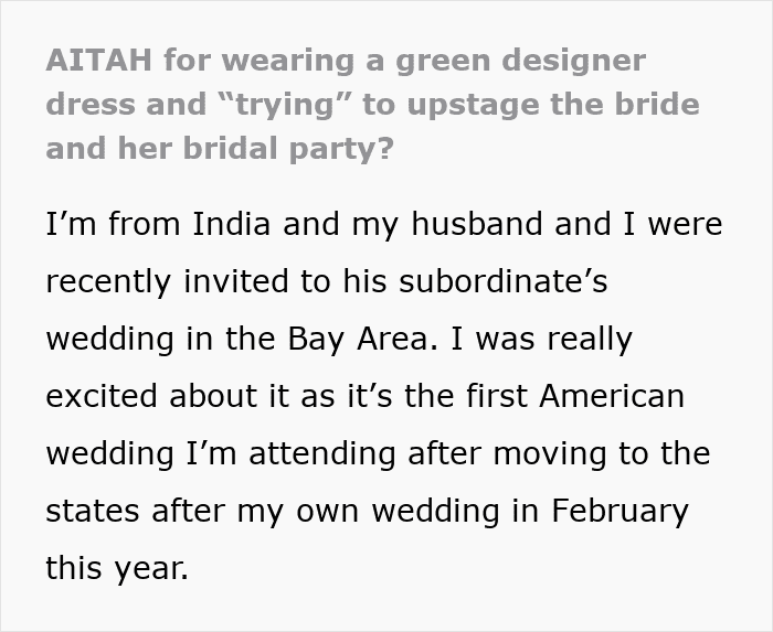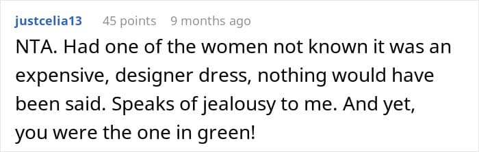 This woman kept that in mind when choosing her outfit, settling on a tasteful green designer dress she thought was elegant yet appropriate. The bride’s party, however, decided it looked too expensive and launched a public smear campaign, accusing her of trying to steal the spotlight.