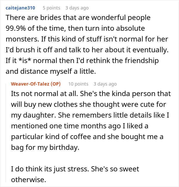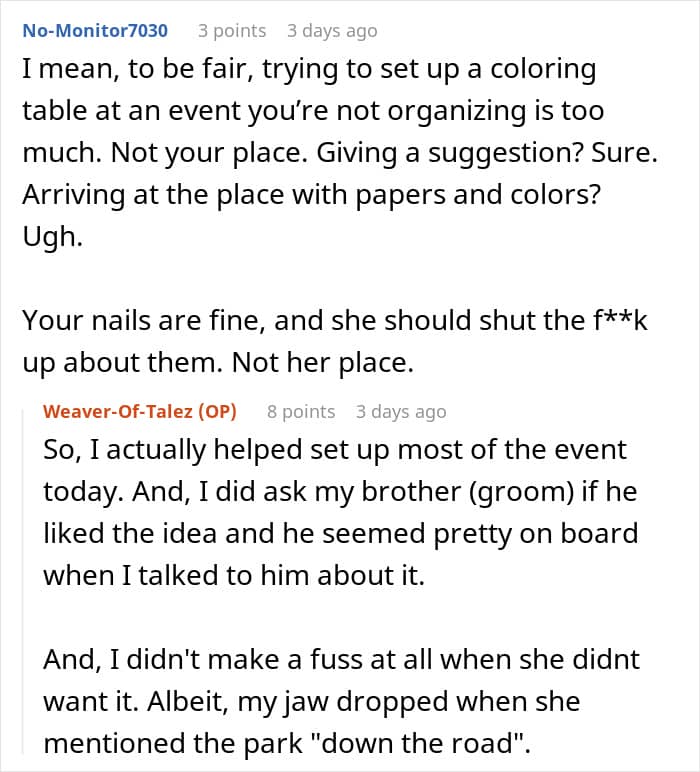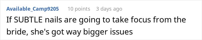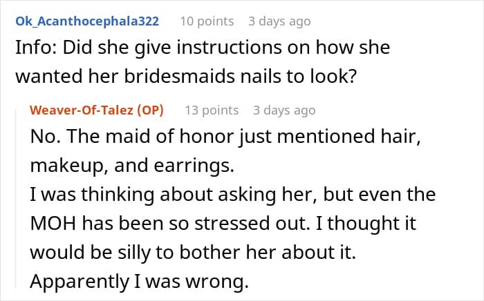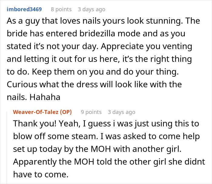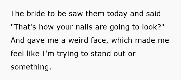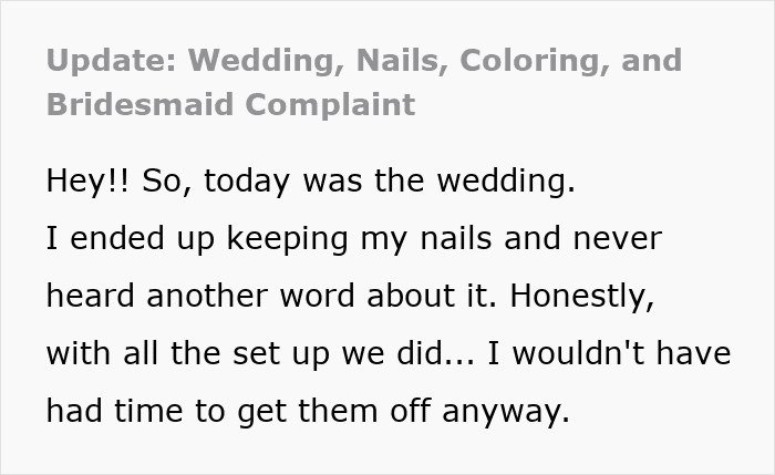A bridesmaid asked the internet for advice on how to handle a bride who seemed to think she got her nails done just to upstage her. Later, she shared how the actual wedding went. We reached out to the woman who made the post via private message and will update the article when she gets back to us.