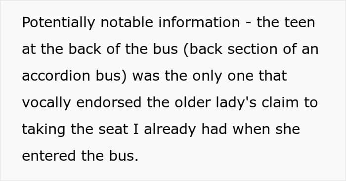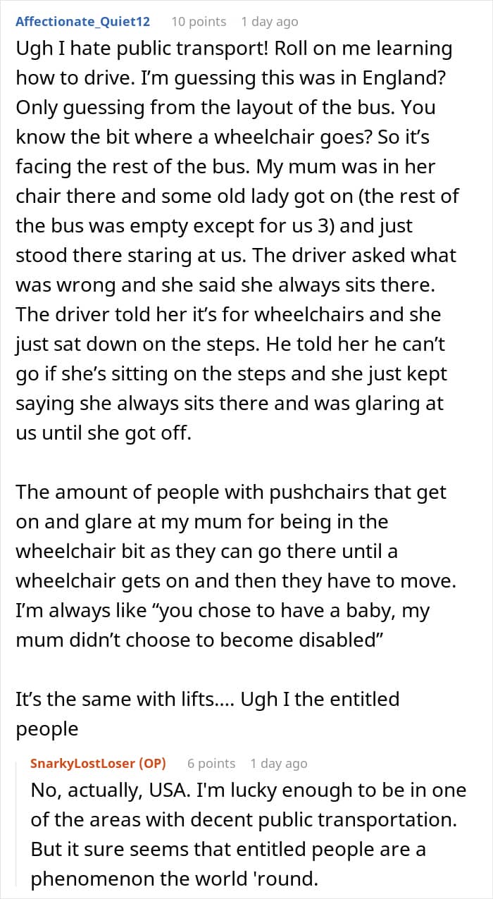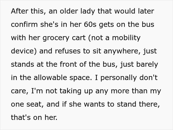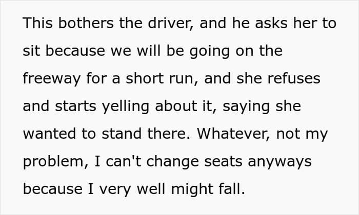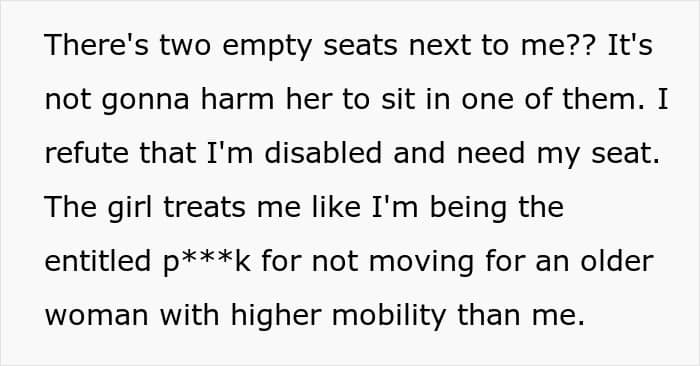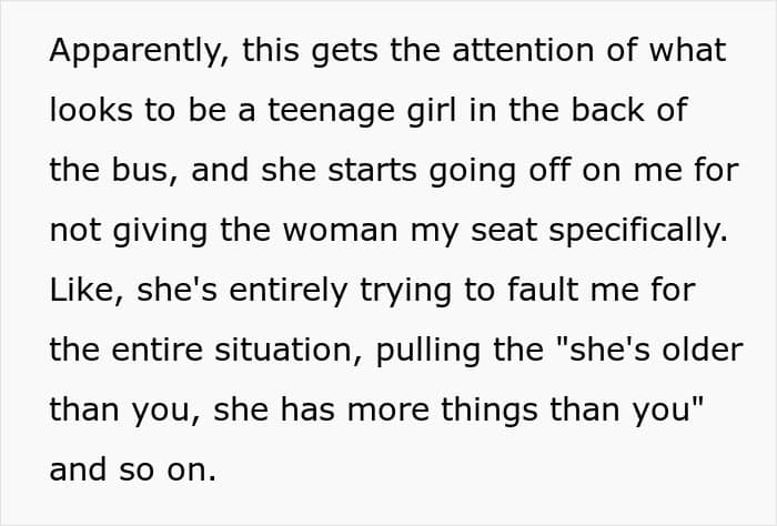 The driver demanded that the lady sit down – simply for safety reasons – but she flatly refused until the OP gave up his seat. At that moment, a teen girl joined her, loudly demanding that the author stand up and vacate the seat. “The girl treats me like I’m being the entitled prick for not moving for an older woman with higher mobility than me,” the author recalls.