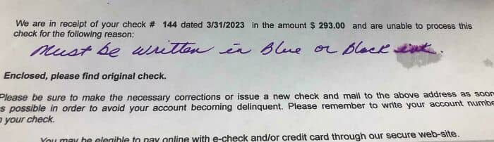 #68 This Letter From My HOA, Written In Purple Ink, Telling Me They Rejected My Check Because It Was Written In Purple Ink
